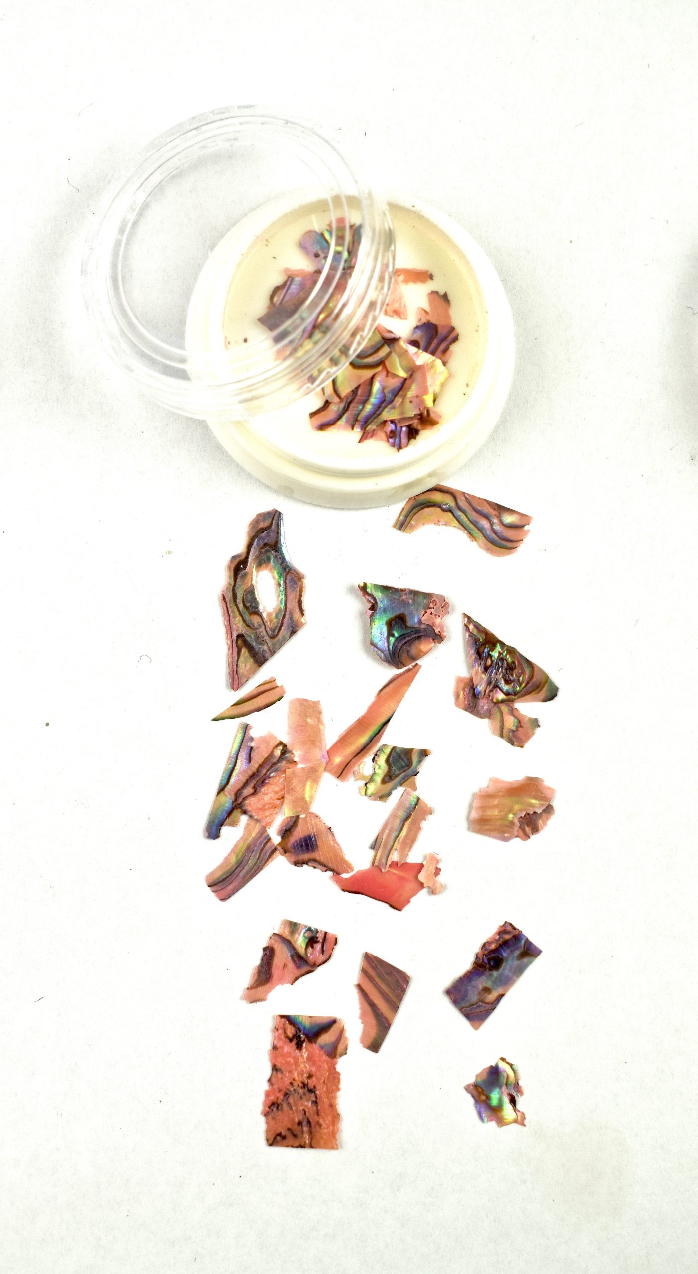 Deze prachtige schelpenfragmenten zorgen voor een luxe en natuurlijke glans in elke inlay. De unieke kleuren en reflecties van abalone komen het mooist tot hun recht wanneer ze worden ingeseald met de Luxurious Diamond Gel, Titanium Gel of Next Gel Real Clear. Zo blijven ze perfect op hun plaats én behouden ze hun sprankelende glans – voor een afwerking die direct de aandacht trekt.